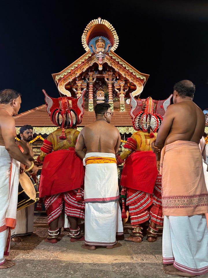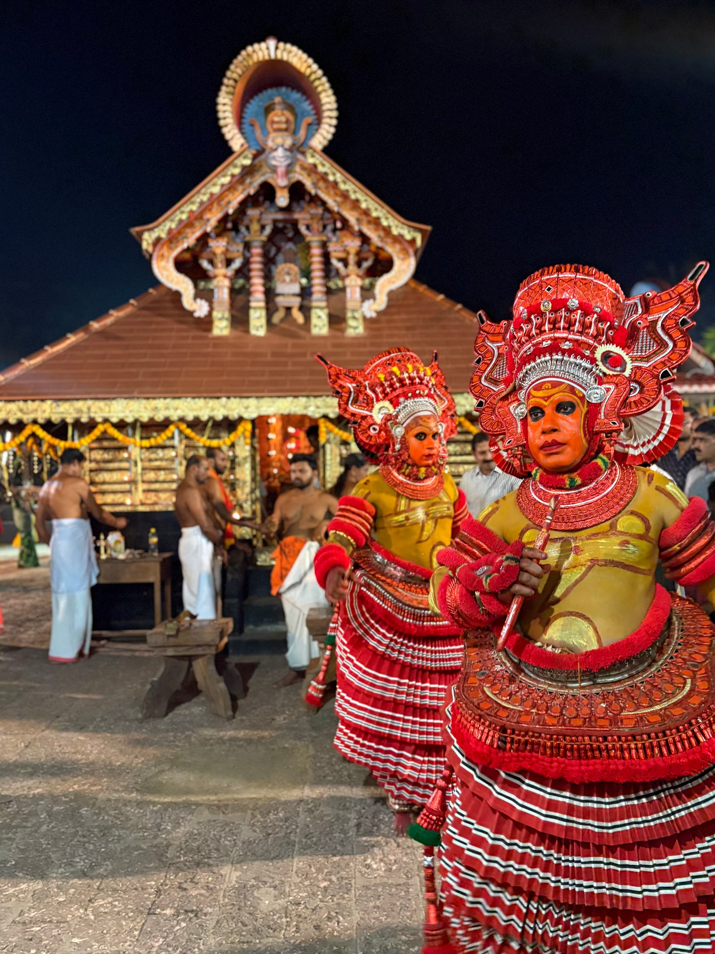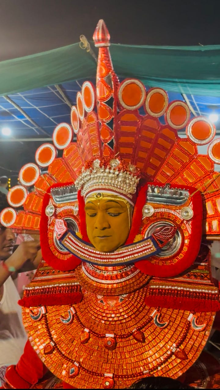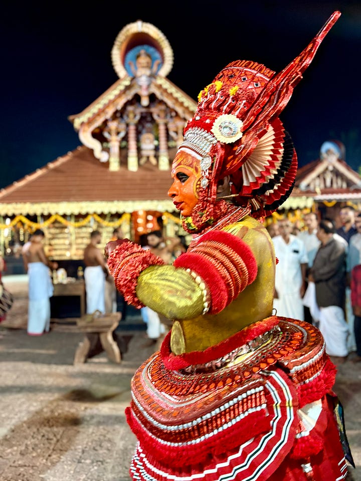 Theyyam is a ritual performance tradition from North Kerala, particularly in Kannur and Kasaragod. The word comes from daivam, meaning “god.”