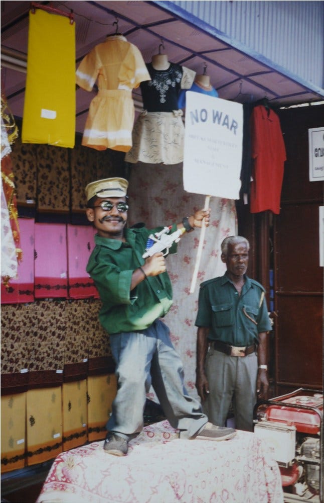 Along the route, protest became spectacle. A shopkeeper displayed two mannequins: one dressed as an American soldier, the other in a blood-stained shirt, an Iraqi civilian. A little person stood on a platform holding a toy gun, smiling as I passed. The man in the wheelchair rolled by again, still shouting. Songs rose and fell through the heat, broken occasionally by men angrily listing the names of countries America had already scarred. Yet beneath it all was sincerity—a collective belief that peace was still worth protecting. People smiled at me with something like gratitude, as if my presence itself affirmed their cause.